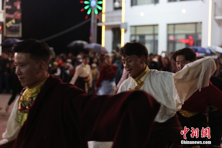 7月15日,西藏自治區(qū)昌都市貢覺縣阿旺綿羊文化商貿(mào)旅游節(jié)在當(dāng)?shù)嘏e行。當(dāng)?shù)孛癖娫陂_幕式前夜點起篝火,載歌載舞歡迎各地游客。