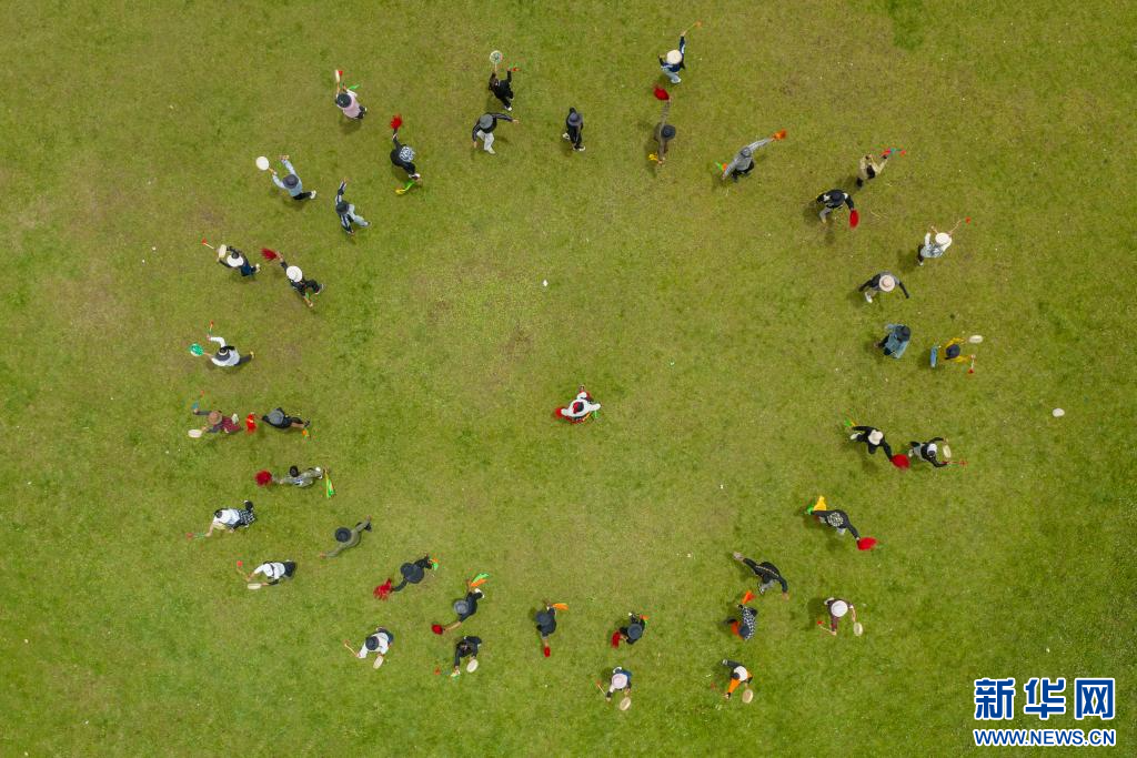 7月12日,西藏昌都市丁青縣尺犢鎮(zhèn)烏巴村文藝演出隊(duì)在排練(無(wú)人機(jī)照片)。 新華網(wǎng) 旦增努布 攝