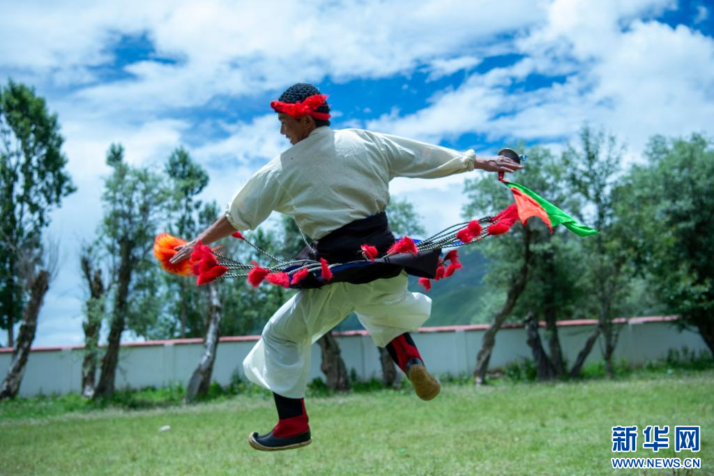 7月12日,西藏昌都市丁青縣尺犢鎮(zhèn)烏巴村文藝演出隊(duì)隊(duì)員在排練。 新華網(wǎng) 旦增努布 攝