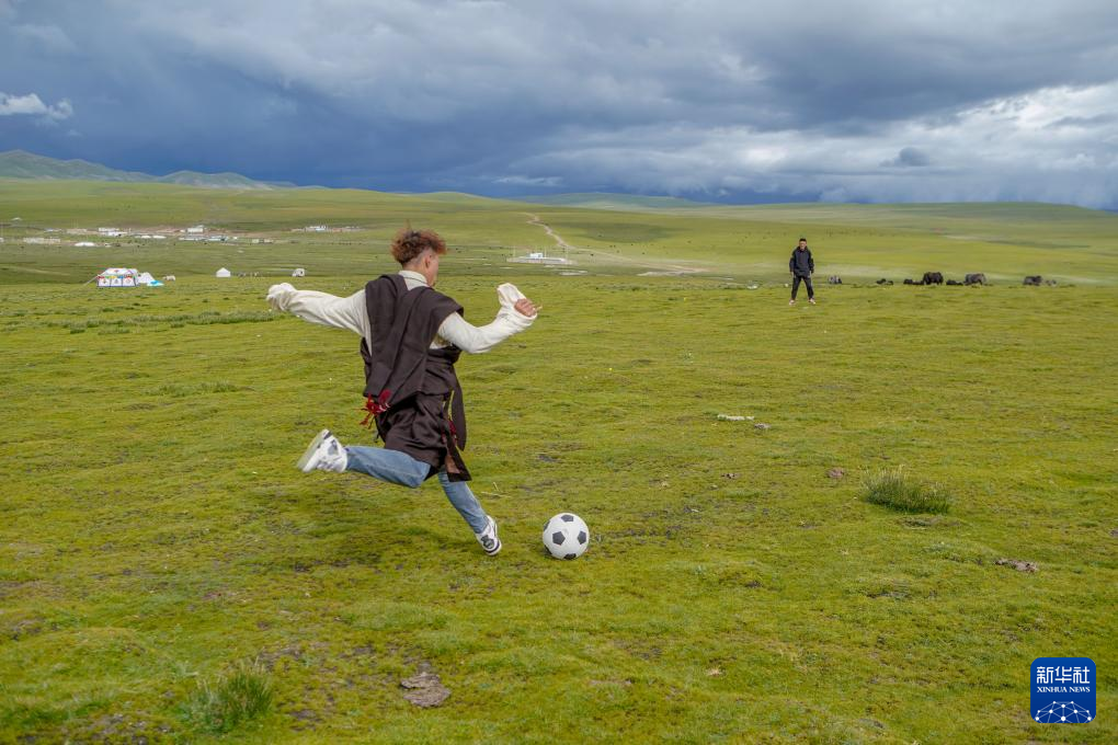 8月11日,旦增旺久和朋友在草原上踢足球。旦增旺久是次扎達兒子列熱覺旦的表哥,遠在千里之外的湖南上學,但還會經常想起“隆達熱巴”。正值暑假,回到草原的他會細心地為“隆達熱巴”梳毛,跟它說悄悄話。新華社記者 邵澤東 攝