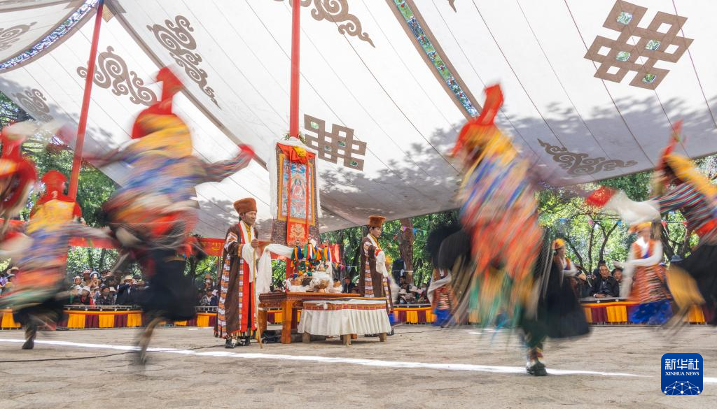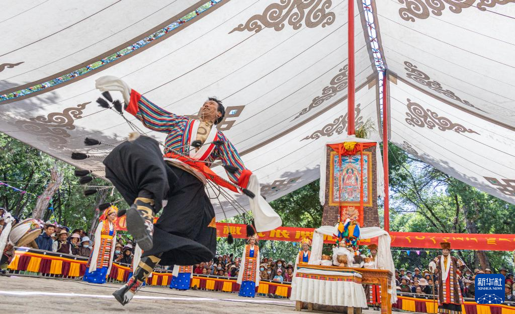 8月19日,在拉薩市羅布林卡園林內(nèi),貢嘎縣乃薩藏戲隊在表演藏戲《朗薩雯崩》。新華社發(fā)(丁增尼達攝)