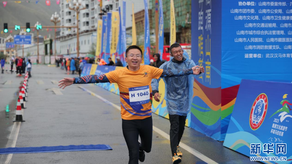 圖為2023雅礱文化旅游節(jié)環(huán)城馬拉松賽選手到達(dá)終點(diǎn)(8月26日攝)。新華網(wǎng) 柑丹鴦琦 攝