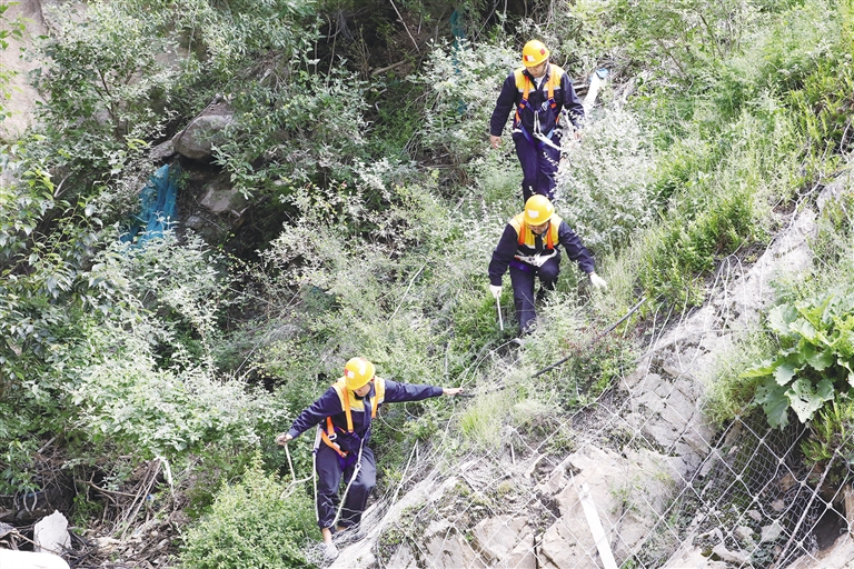 “剛下過雨,地面濕滑,大家一定要抓牢踩實,防止滑倒。”走在最前面的工長東生瑞轉(zhuǎn)身大聲提示大家,他的聲音隨風在山谷間回蕩。在一段陡峭的山路旁,來自東北的“00后”小伙杜猛發(fā)現(xiàn)一塊大石頭下面有空虛的跡象,他立即向東生瑞匯報,并拿出自噴漆,在石頭周圍噴上記號和巡視日期。