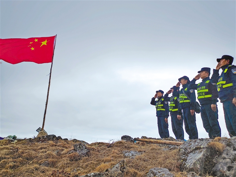 立新邊境派出所民警前往仁滇牧場(chǎng)巡邏踏查時(shí)向國旗宣誓。圖片由日喀則邊境管理支隊(duì)提供