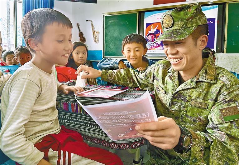 圖為在林芝市墨脫縣格當(dāng)鄉(xiāng),駐地官兵為小學(xué)生普及國防知識。郎玲 記者 王敏 攝