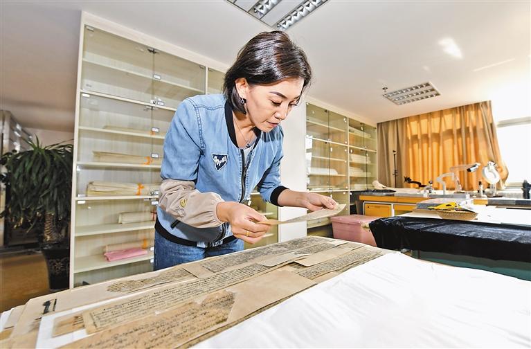 西藏自治區(qū)圖書館古籍保護中心工作人員在清理修復(fù)古籍。唐斌 攝