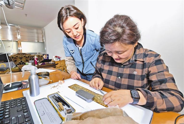 西藏自治區(qū)圖書館古籍保護中心工作人員在進行古籍粘貼修復(fù)。唐斌 攝