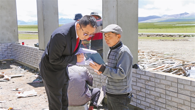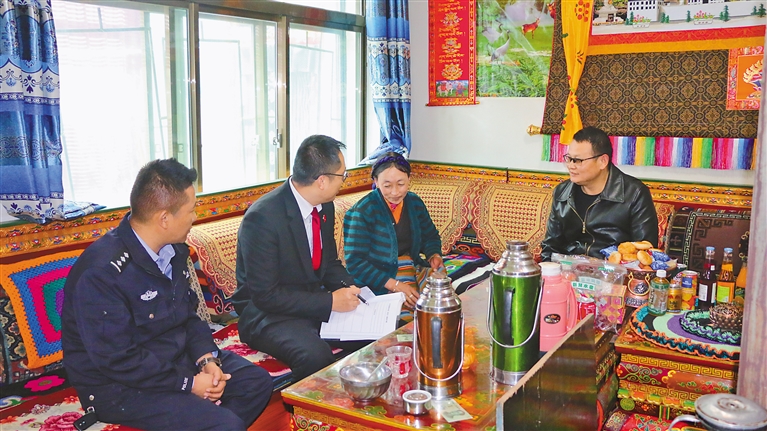 普瑪江塘中心法庭負責(zé)人巴桑次仁(左)正在向務(wù)工人員了解相關(guān)情況。