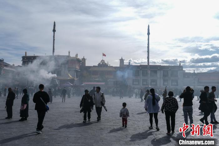 圖為9月30日上午,游客、市民在大昭寺廣場(chǎng)。當(dāng)日恰逢轉(zhuǎn)經(jīng)日,大昭寺、八廓街桑煙氤氳,熱鬧非常。江飛波 攝