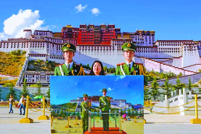 圖為青年畫家劉雪萍與執(zhí)勤哨兵在布達(dá)拉宮前合影。記者 格桑倫珠 攝