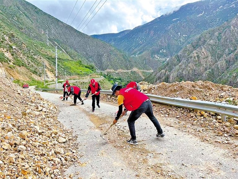 圖為芒康縣曲登鄉(xiāng)黨員開展志愿服務活動,清理阻塞道路的落石。