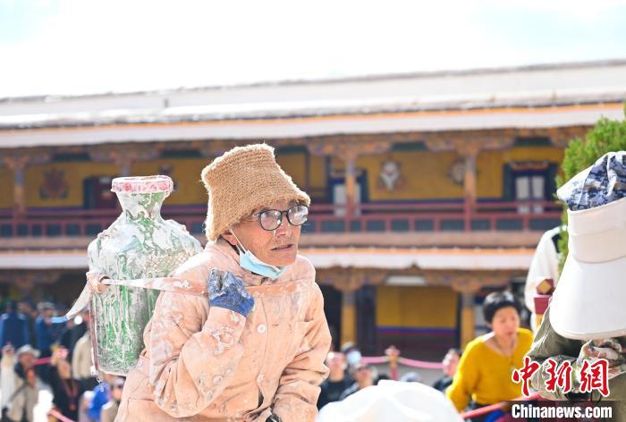 人群中的志愿者旺久來(lái)自山南市,自己做生意。他說(shuō):“放下家里的事情,過(guò)來(lái)朝佛也幫忙粉刷,帶了牛奶過(guò)來(lái),后面幾天也要參加。”