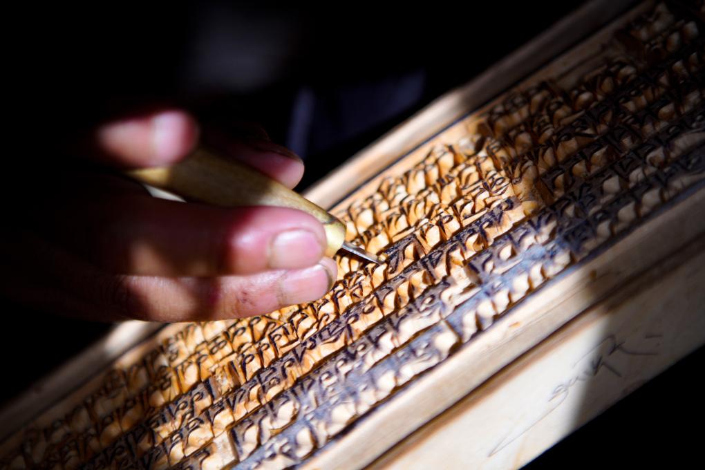 波羅刻版制作并不容易,包括切割、曬油、加固等十多道工序。澤培說(shuō):“我們一般選用優(yōu)質(zhì)的紅樺樹(shù),必須要耐磨、沒(méi)有裂縫。正式刻制時(shí),每一個(gè)字都必須與模板相對(duì)應(yīng),不能跑偏、變形。要想雕刻好,需要熟練掌握藏文書(shū)法等相關(guān)知識(shí)。一個(gè)字刻壞了,整個(gè)作品就毀了?!?/p>