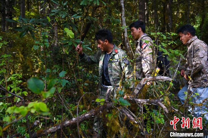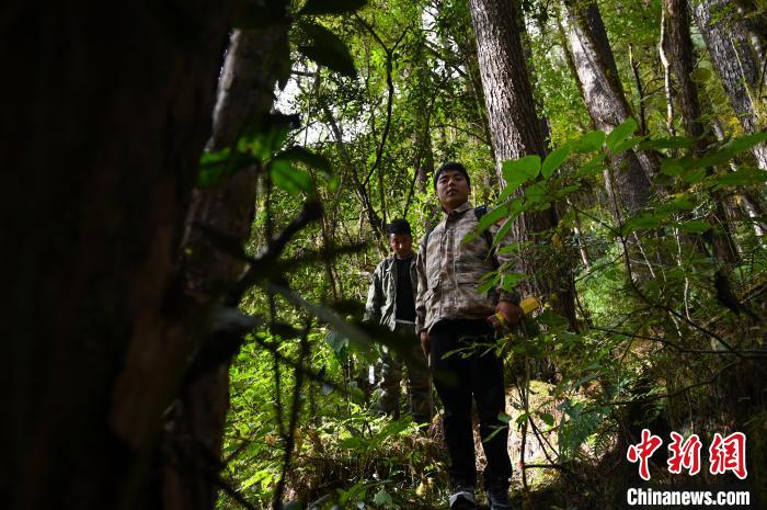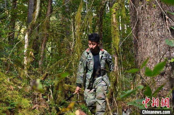 3名管護員到達格當鄉(xiāng)最深處的一片原始森林。正值深秋,對于管護員們來說是最好的季節(jié),雨季結(jié)束,蚊蟲也少。他們僅帶了背包和道具,管護站副站長索朗羅珠說:“今天不用過夜,帶的裝備很簡單。”