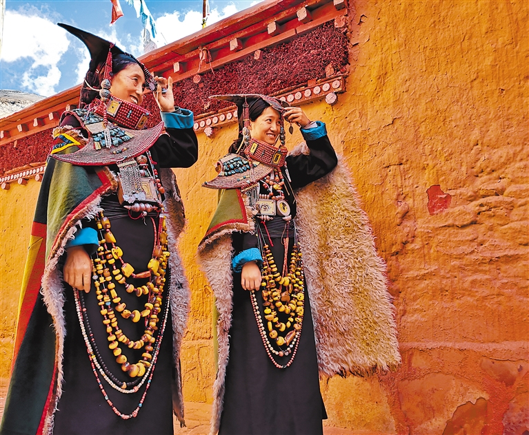 一大早,19歲的少女巴桑倉決和表姐巴桑普赤就開始整理各自傳承的“飛天服”。她們打開箱子,拿出精致的衣袍、披風和綴滿珠寶的頭飾、項鏈,鄭重地穿戴在身上。當整套“飛天服”呈現(xiàn)在眾人眼前時,大家無不為之驚嘆。