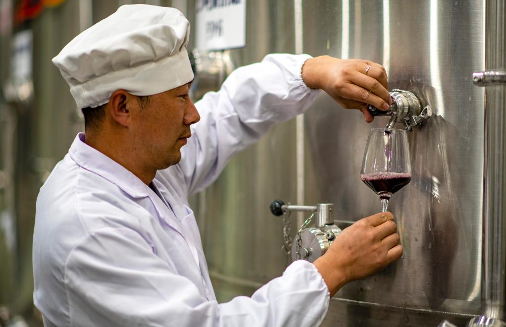 釀酒師李曉平在取酒樣(7月26日攝)。新華社記者 姜帆 攝