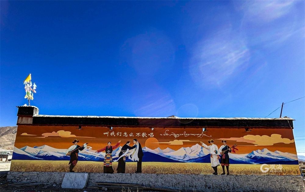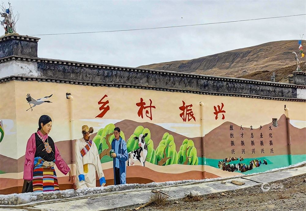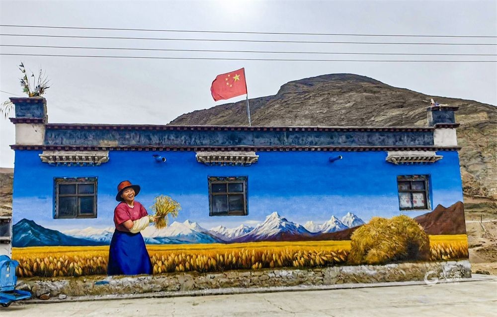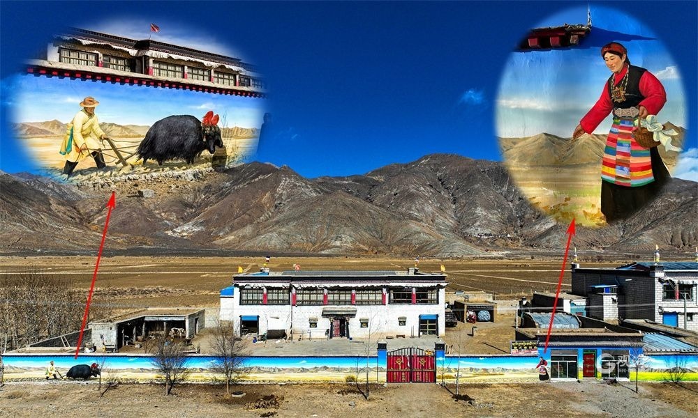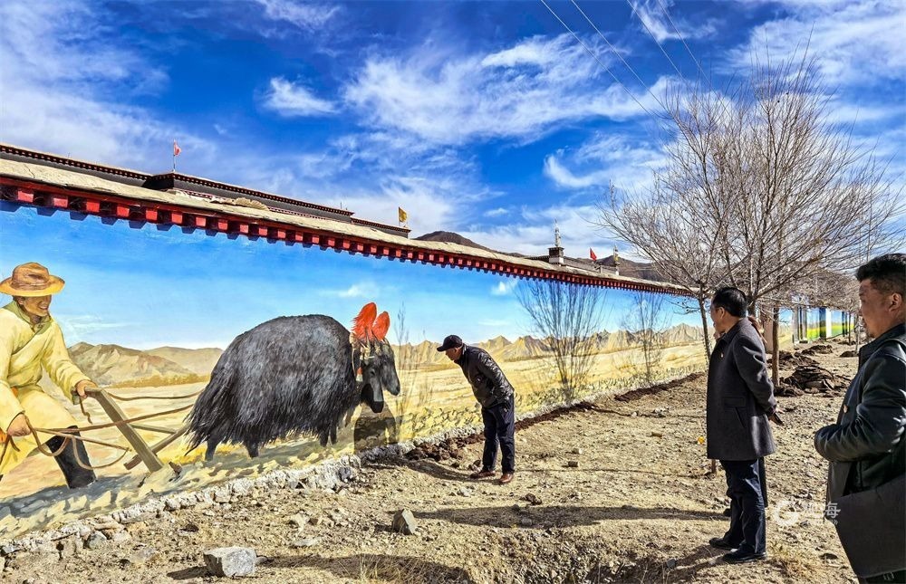 廣袤的高原上,在連綿起伏的山巒之下,是藏族農(nóng)家趕著傳統(tǒng)的“二牛抬杠”耕耘的場景,旁邊的“阿佳”則撒下希望的青稞種子……這樣的場景當(dāng)然不會出現(xiàn)在現(xiàn)在這個滴水成冰的季節(jié),而是躍然于藏家傳統(tǒng)村居的院墻之上。“我家這面墻原來就是貼滿了牛糞,現(xiàn)在畫上了我們平時勞動的景象,感覺比之前更好看了。”桑珠孜區(qū)東嘎鄉(xiāng)色定村的村民旦瓊說,此前的一年又一年,他都是把牛糞貼在墻上,固然有傳統(tǒng)的高原美感,但是與現(xiàn)在院墻上畫的鄉(xiāng)村振興的場景相比,還是現(xiàn)在的感覺更不錯。