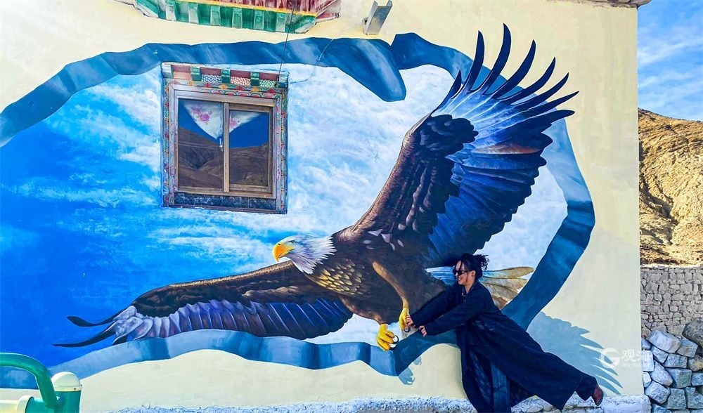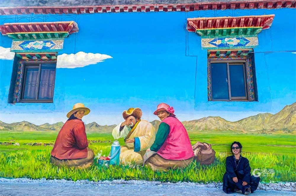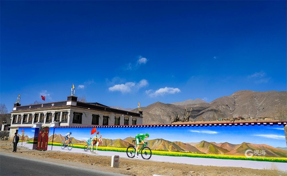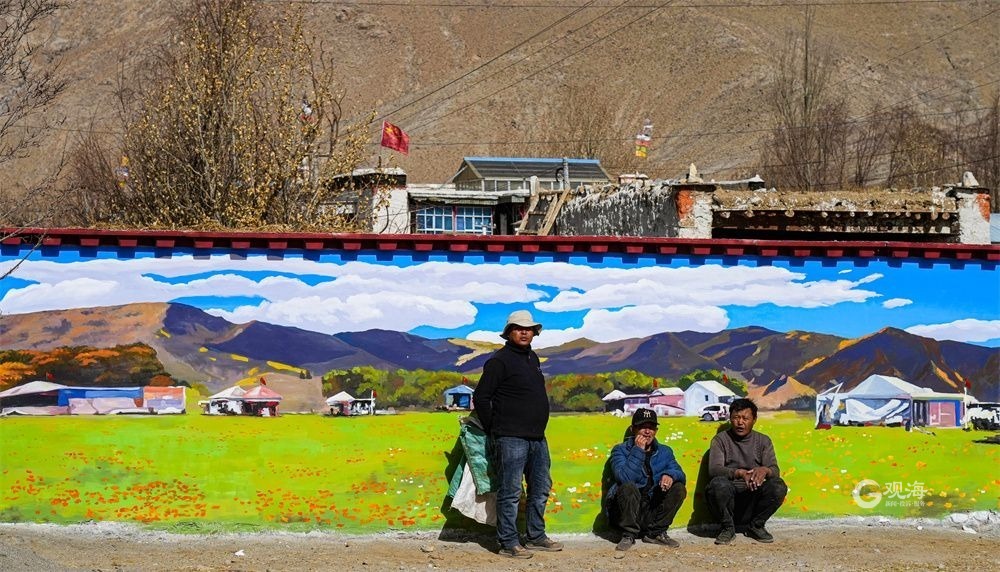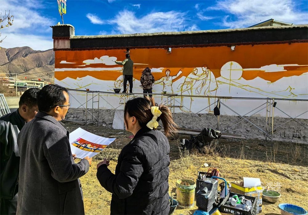 廣袤的高原上,在連綿起伏的山巒之下,是藏族農(nóng)家趕著傳統(tǒng)的“二牛抬杠”耕耘的場景,旁邊的“阿佳”則撒下希望的青稞種子……這樣的場景當(dāng)然不會出現(xiàn)在現(xiàn)在這個滴水成冰的季節(jié),而是躍然于藏家傳統(tǒng)村居的院墻之上。“我家這面墻原來就是貼滿了牛糞,現(xiàn)在畫上了我們平時勞動的景象,感覺比之前更好看了。”桑珠孜區(qū)東嘎鄉(xiāng)色定村的村民旦瓊說,此前的一年又一年,他都是把牛糞貼在墻上,固然有傳統(tǒng)的高原美感,但是與現(xiàn)在院墻上畫的鄉(xiāng)村振興的場景相比,還是現(xiàn)在的感覺更不錯。