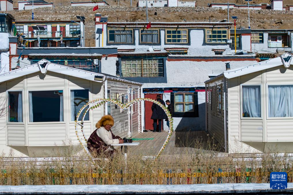 尼瑪縣文部鄉(xiāng)文部南村村民尼瑪扎巴坐在自己的“太空艙旅店”的椅子上(無(wú)人機(jī)照片,12月20日攝)。新華社記者 格桑朗杰 攝