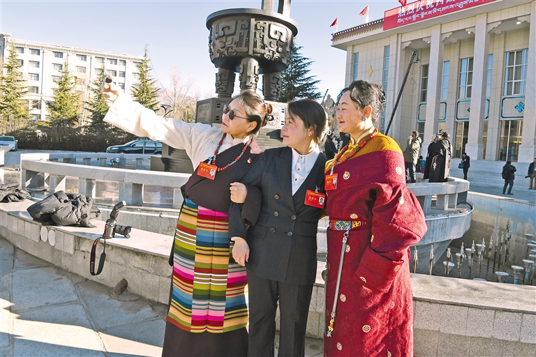 代表們?cè)谖鞑厝嗣駮?huì)堂前合影留念。記者 王敏 攝