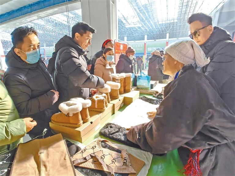 圖為市民購(gòu)買嘎措羊皮雪地靴。本報(bào)記者 趙書彬 攝