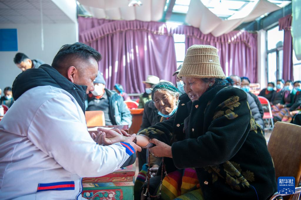 1月27日,加央醫(yī)生在給曲珍老人把脈。新華社記者 劉文博 攝