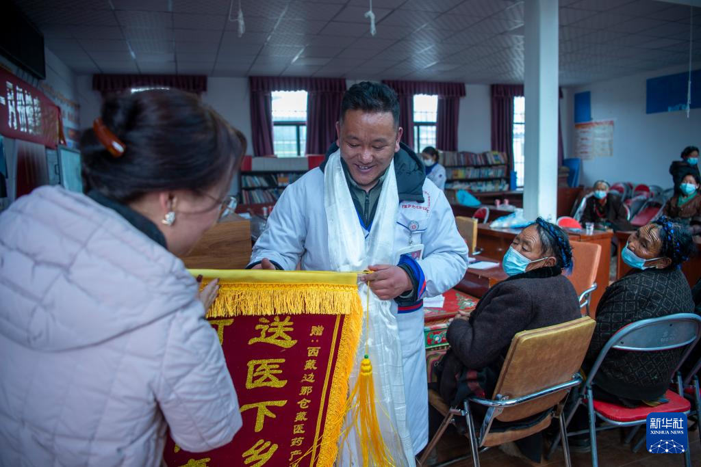 義診活動(dòng)即將結(jié)束時(shí),拉布村駐村工作隊(duì)為加央和同事們送來(lái)了錦旗。工作隊(duì)隊(duì)長(zhǎng)邊巴卓瑪講:“義診活動(dòng)很有意義。醫(yī)生們到了村里,能解決農(nóng)牧民看病難的問(wèn)題,我們真的很感謝他們?!?/p>