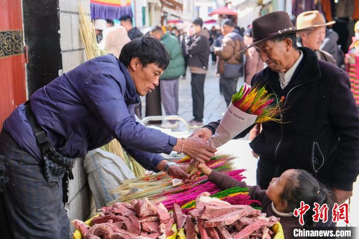 2月5日,拉薩藏歷新年年貨市場,桑旦賣出一把羅薩美朵。中新社記者 江飛波 攝