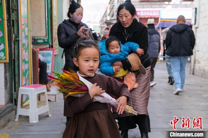 2月5日,拉薩沖賽康附近年貨市場,4歲的旦增色宗抱著一把羅薩美朵。中新社記者 江飛波 攝