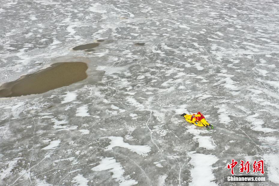 圖為冰湖演練現(xiàn)場,救援人員向“被困人員”靠近。姚天銳 攝