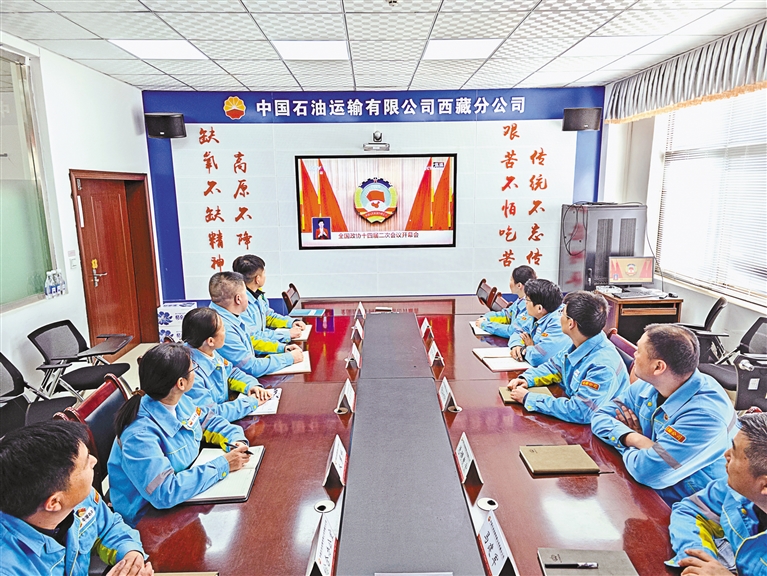 中國(guó)石油運(yùn)輸西藏分公司組織員工收看全國(guó)政協(xié)十四屆二次會(huì)議開(kāi)幕會(huì)。格桑旦增 記者 次仁平措 攝