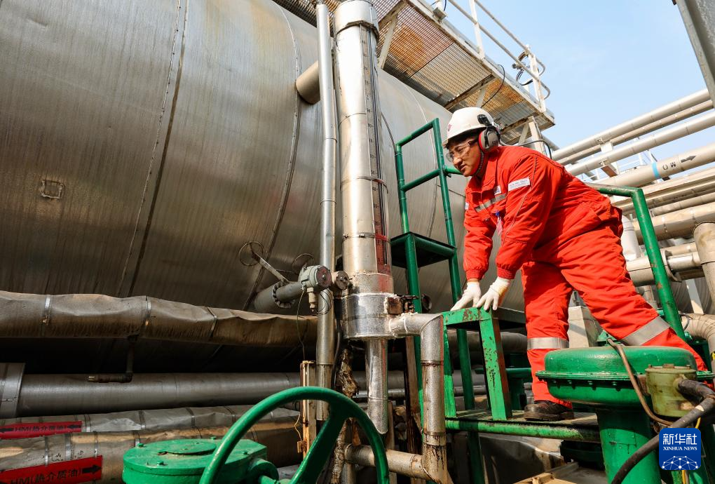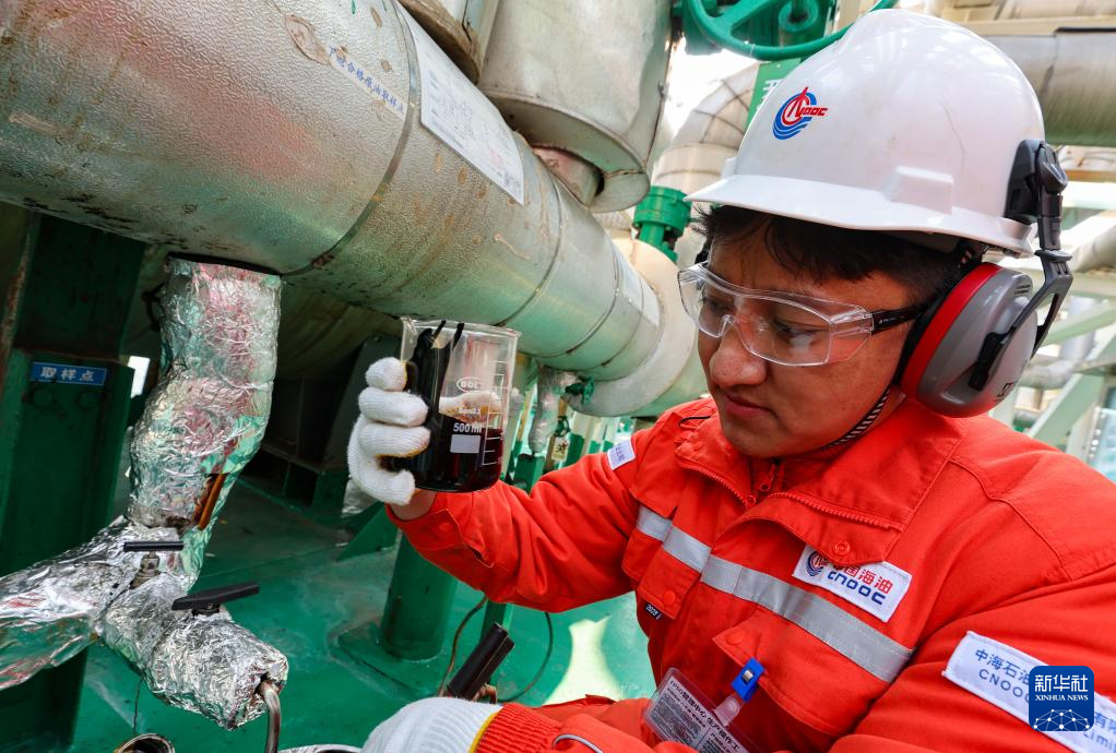 強巴在秦皇島32-6油田“渤海世紀號”(FPSO)16萬噸級浮式生產(chǎn)儲油裝置上檢查原油油樣(3月7日攝)。新華社記者 姜帆 攝