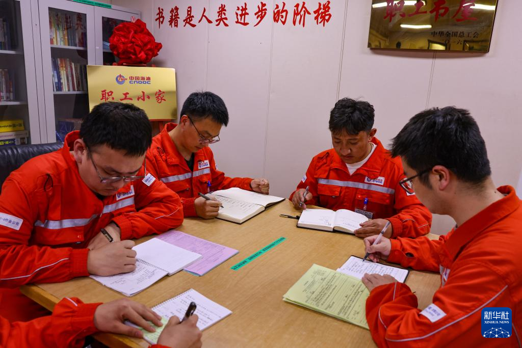在秦皇島32-6油田“渤海世紀號”(FPSO)16萬噸級浮式生產(chǎn)儲油裝置上,強巴(右二)輪班結束后參加班組總結會(3月7日攝)。新華社記者 黃耀漫 攝