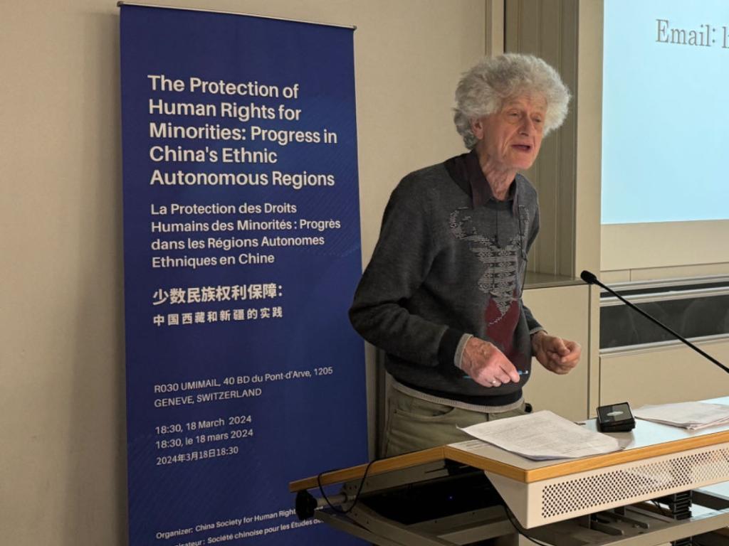 3月18日,由中國人權(quán)研究會主辦的“少數(shù)民族權(quán)利保障:中國西藏和新疆實踐”主題講座在瑞士日內(nèi)瓦舉行。圖為比利時知名藏學(xué)家安德烈·拉克魯瓦在講座上發(fā)言。新華社記者石松攝