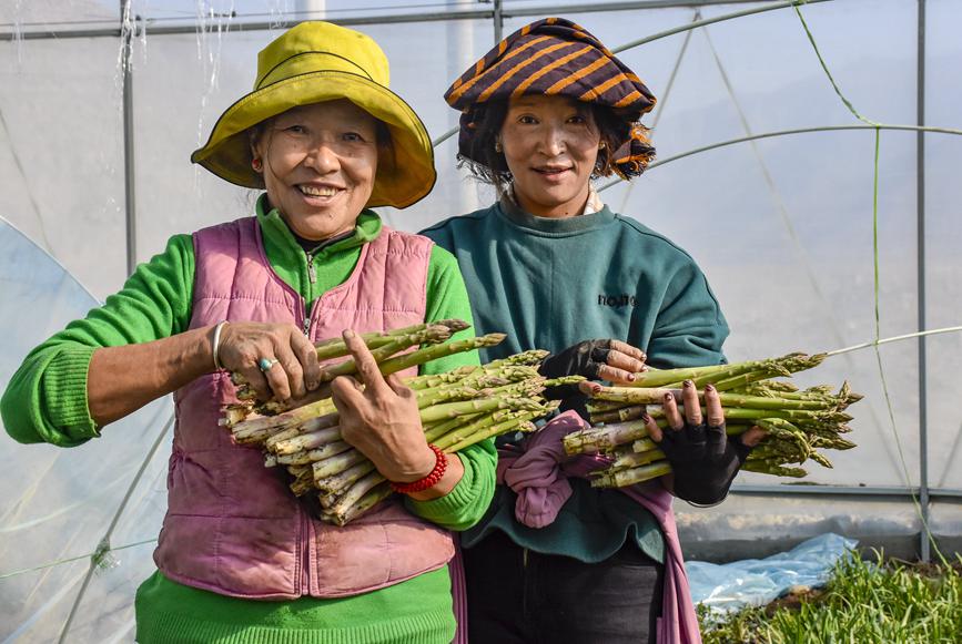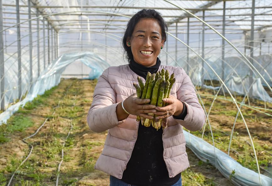 章達(dá)村村民次仁卓瑪展示高原有機(jī)蘆筍。劉楓攝