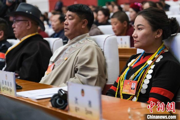 資料圖為2024年1月9日,西藏自治區(qū)兩會(huì)期間,少數(shù)民族界政協(xié)委員、墨脫縣達(dá)木珞巴民族鄉(xiāng)女鄉(xiāng)長(zhǎng)布姆曲珍(右一)在拉薩參會(huì)。江飛波 攝