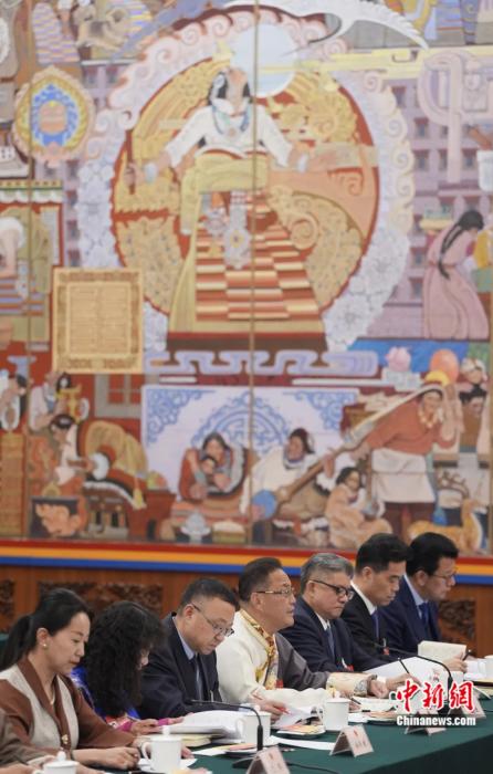 2024年3月6日,出席十四屆全國人大二次會(huì)議的西藏代表團(tuán)在北京人民大會(huì)堂西藏廳舉行開放團(tuán)組會(huì)議,審議政府工作報(bào)告并回答記者提問。崔楠 攝