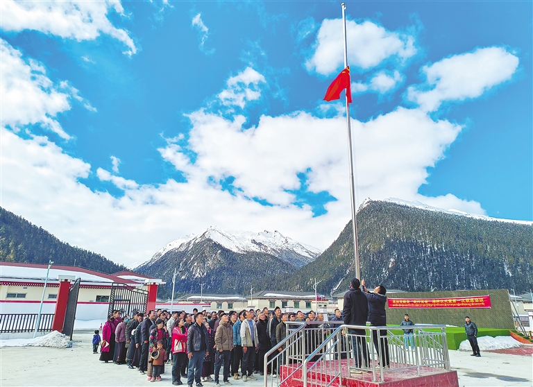 3月28日,米林市里龍鄉(xiāng)才巴村朗貢搬遷點的群眾舉行紀(jì)念西藏百萬農(nóng)奴解放65周年升國旗儀式。周宇 記者 丹增群培 攝