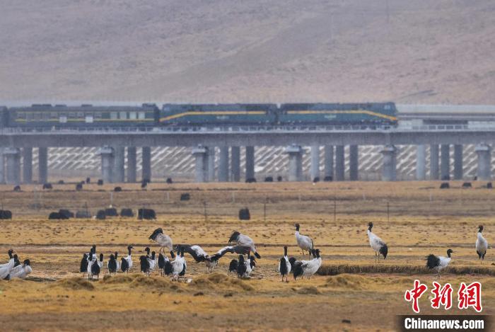 遠(yuǎn)處,有火車沿著青藏鐵路鳴笛經(jīng)過,黑頸鶴們“淡定一瞥”,仿若未聞其聲,繼續(xù)欣賞水中的倒影,于鳥鳴處處,水聲悠悠間自得其樂。