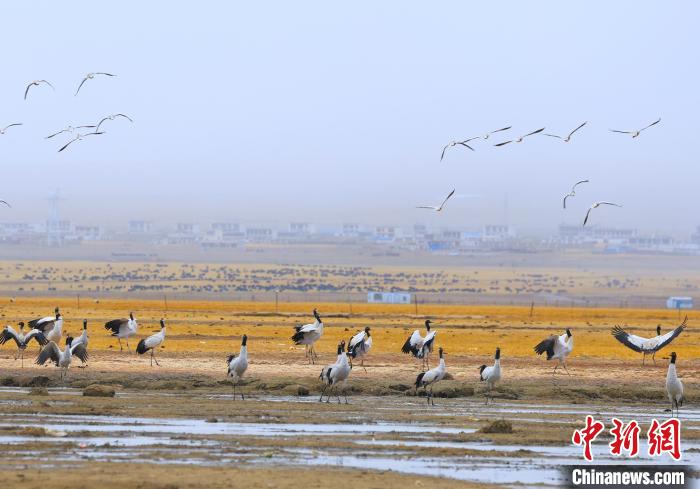 金色的陽光灑在阿熱濕地的草甸上,黑頸鶴們時而展翅翩飛,時而嬉戲覓食,或盤旋在濕地上空,接著在不遠(yuǎn)處停落,或優(yōu)哉游哉地在淺灘處覓食、嬉水、跳舞,呈現(xiàn)出一幅幅鶴舞高原的美景圖,如夢如幻地定格在念青唐古拉山的春天里。