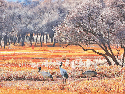 在西藏日喀則市拉孜縣扎西宗鄉(xiāng)沙棘林中覓食的黑頸鶴。益西旦增攝