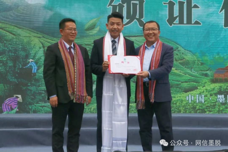 伴隨著春風(fēng)中浸染的裊裊茶香,開幕式上的一段視頻吸引了觀眾們的注意,視頻中丹臻群佩在央視主持人大賽的舞臺(tái)上向全國人民展示了墨脫通車十年以來的壯美巨變,講述了茶葉為墨脫人民的生活帶來的嶄新面貌,他的傾情推介帶領(lǐng)著觀眾再次感受了墨脫的極致美景,體會(huì)了新時(shí)代墨脫人民欣欣向榮的美好生活。在現(xiàn)場,林芝市委常委、墨脫縣委書記符永波為丹臻群佩頒發(fā)“中國·墨脫文化旅游形象大使”證書。隨后,符永波宣布,2024年墨脫縣首屆茶文化旅游季正式開幕!
