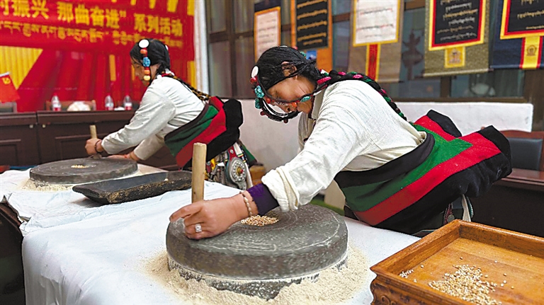 圖為在第三屆“鄉(xiāng)村振興 那曲奮進(jìn)”農(nóng)牧民技能大賽中,巴青縣農(nóng)牧民參賽選手進(jìn)行手工磨糌粑。記者 萬靖 攝