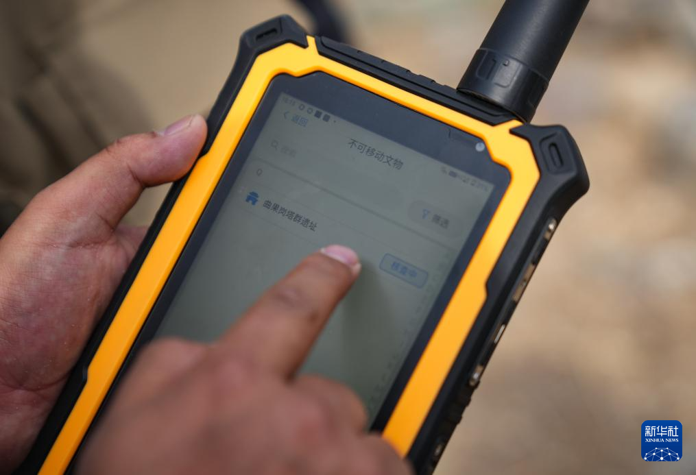 4月11日,普查人員手持移動(dòng)端數(shù)據(jù)采集設(shè)備在曲果崗塔群遺址現(xiàn)場開展數(shù)據(jù)采集。新華社記者 晉美多吉 攝