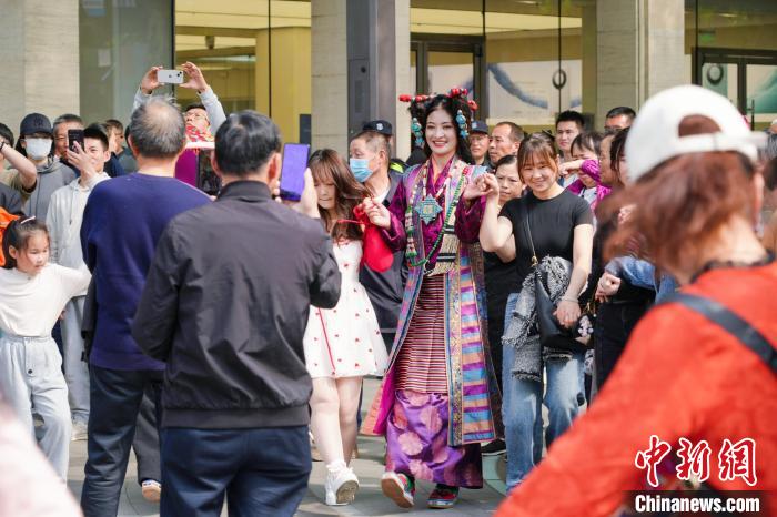 此次文旅推廣活動中,主辦方在西子湖畔舉辦了一場藏裝時(shí)裝秀,十多位拉薩市當(dāng)雄縣藝術(shù)團(tuán)的演職人員身著各式藏裝獻(xiàn)上文藝表演、時(shí)裝走秀,吸引廣大游客駐足參與互動。