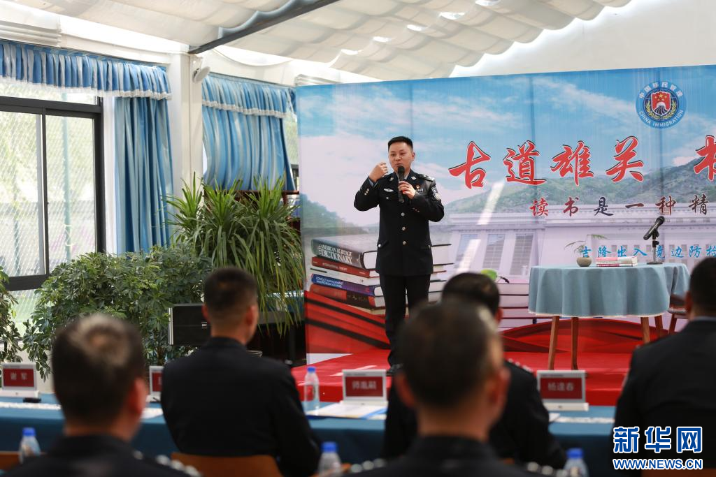 在“古道雄關(guān) 書(shū)香國(guó)門(mén)”主題讀書(shū)分享會(huì)上分享者黃耀軍正在向全站移民管理警察分享讀書(shū)心得(4月19日攝)。肖富貴 攝