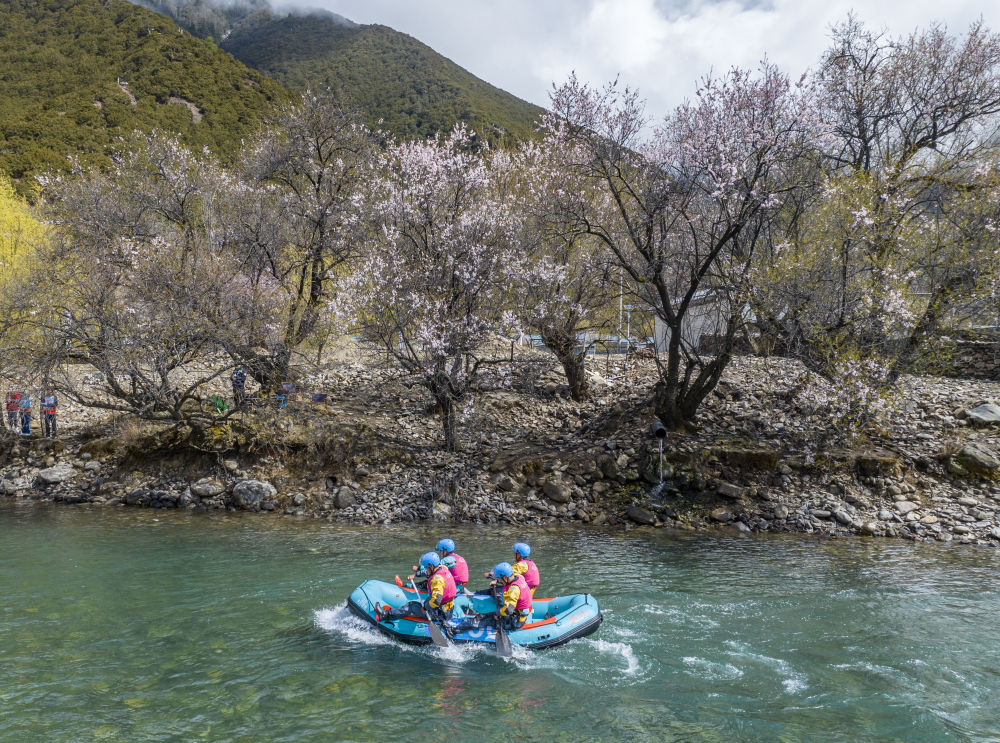 選手們在進行兩人漂流艇競速賽比賽(4月20日攝,無人機照片)。新華社記者 孫非 攝