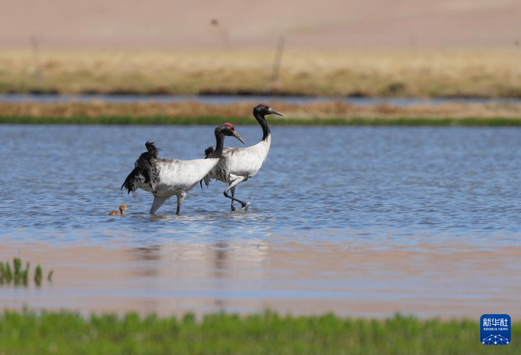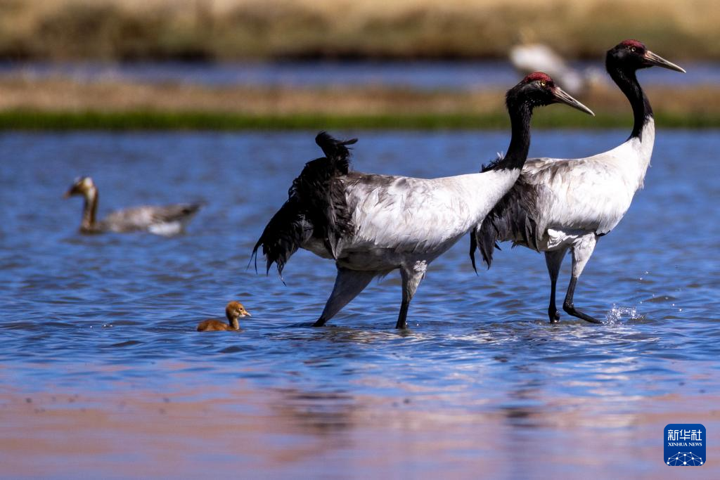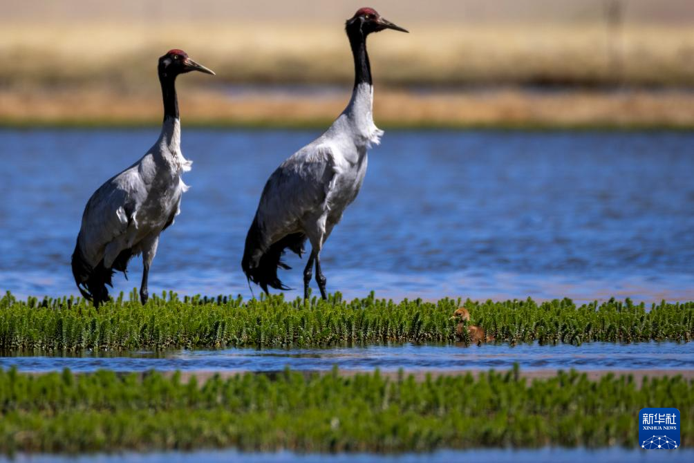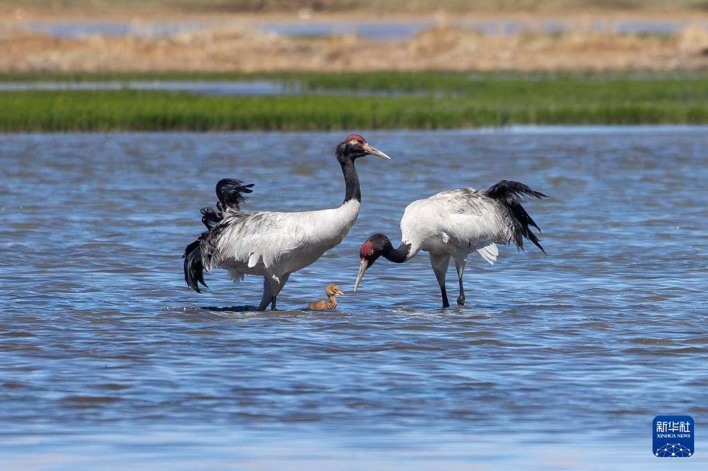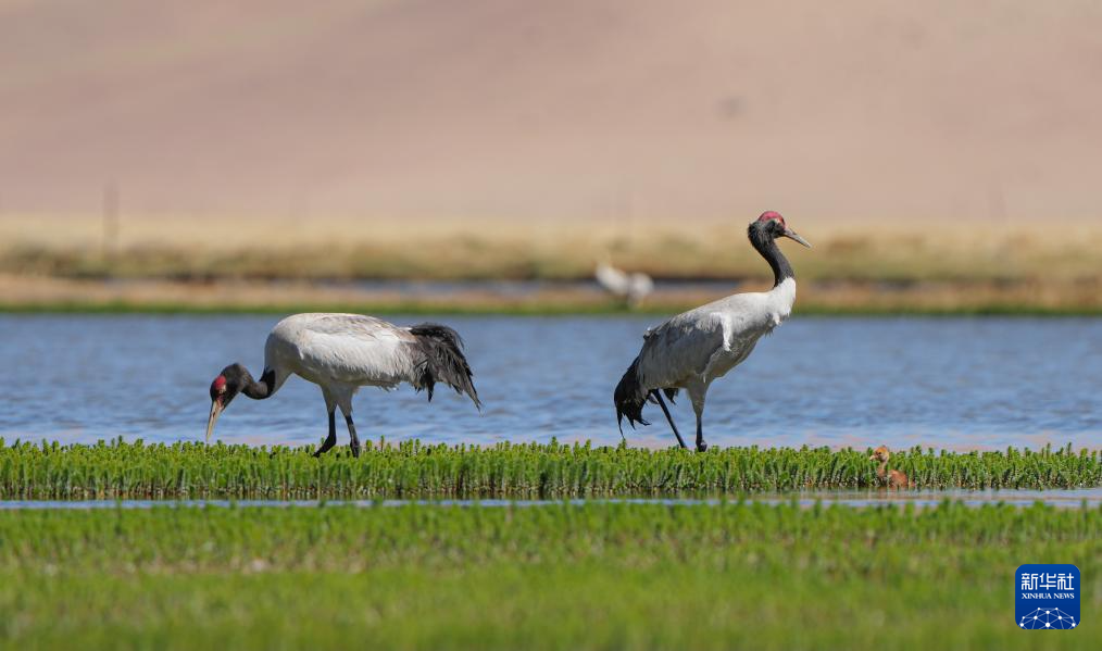6月9日,一對(duì)黑頸鶴夫婦帶著雛鳥在西藏那曲市申扎縣一處濕地棲息、覓食。新華社記者 旦增尼瑪曲珠 攝