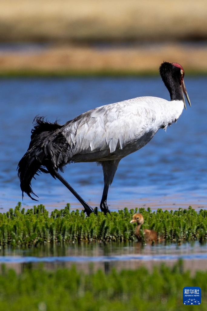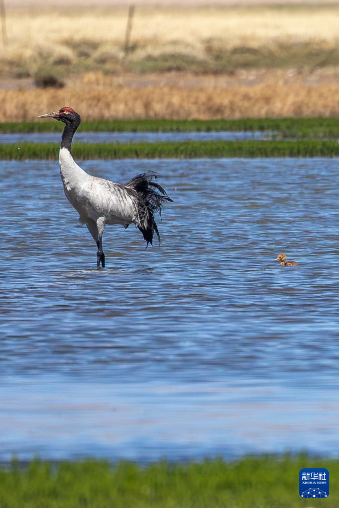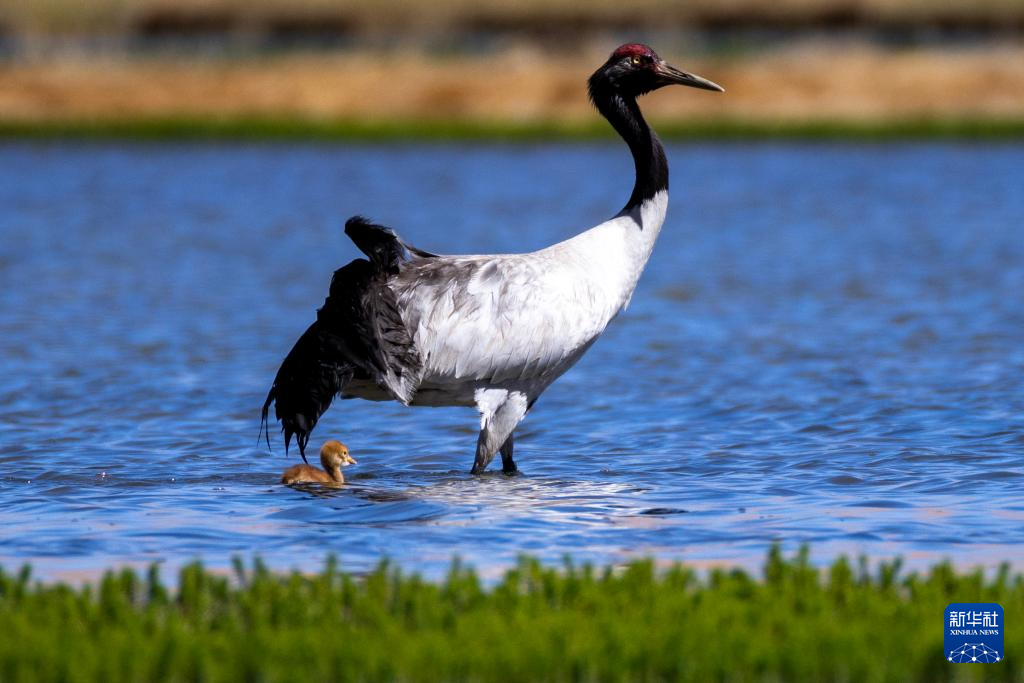 6月9日,黑頸鶴帶著雛鳥在西藏那曲市申扎縣一處濕地棲息、覓食。新華社記者 姜帆 攝