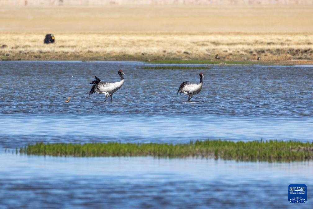 6月9日,一對(duì)黑頸鶴夫婦帶著雛鳥在西藏那曲市申扎縣一處濕地棲息、覓食。新華社記者 晉美多吉 攝